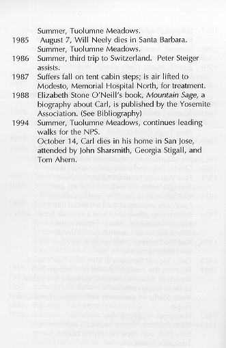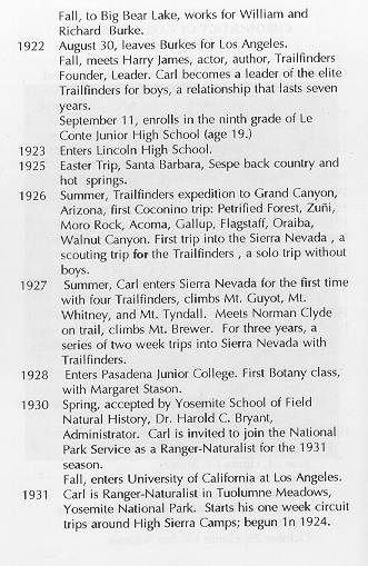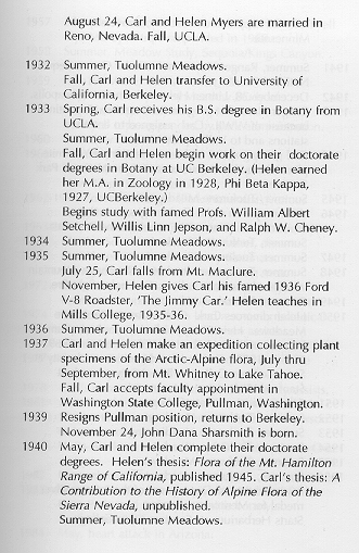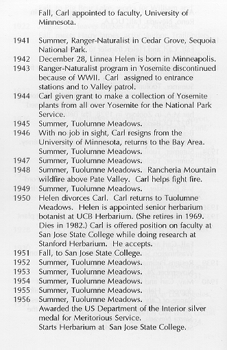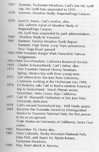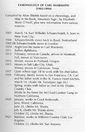 From Sharsmith, John and Shields, Allan, 1996, Climb Every Mountain: A Portrait of Carl Sharsmith. Jerseydale Ranch Press: Mariposa, CA. Pages xiv-xxiv. Permission to reproduce this chronology on the website name4carl.org received from Allan Shields, 4/20/06.