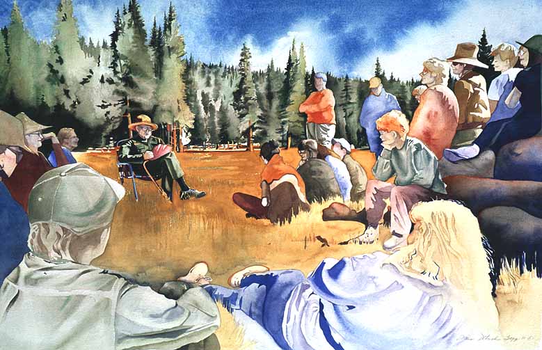 Carl at work in a later year, with admirers. Watercolor by Diane Detrick Bopp at www.yosemitemusic.com, used with permission.