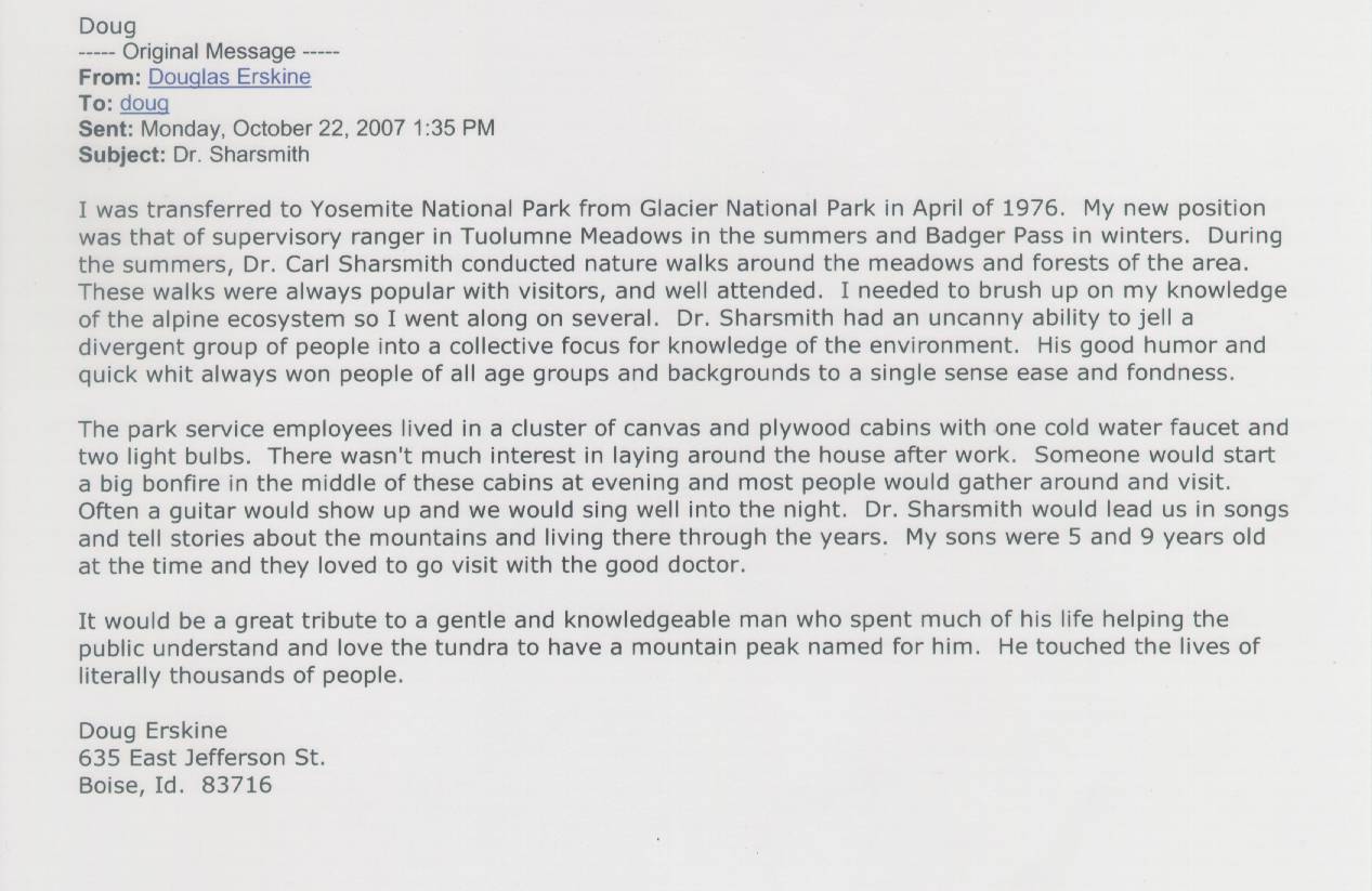 Home & Synopsis/Status Reports   Purpose & Method  Who was Carl Sharsmith?  Why name a Yosemite feature for Carl?/Origin of Proposal   Which feature should be named for Carl?   How can a feature be named for Carl?   SUMMARY OF SUPPORTING STATEMENTS   Contacts/Resources Webmaster Search Form