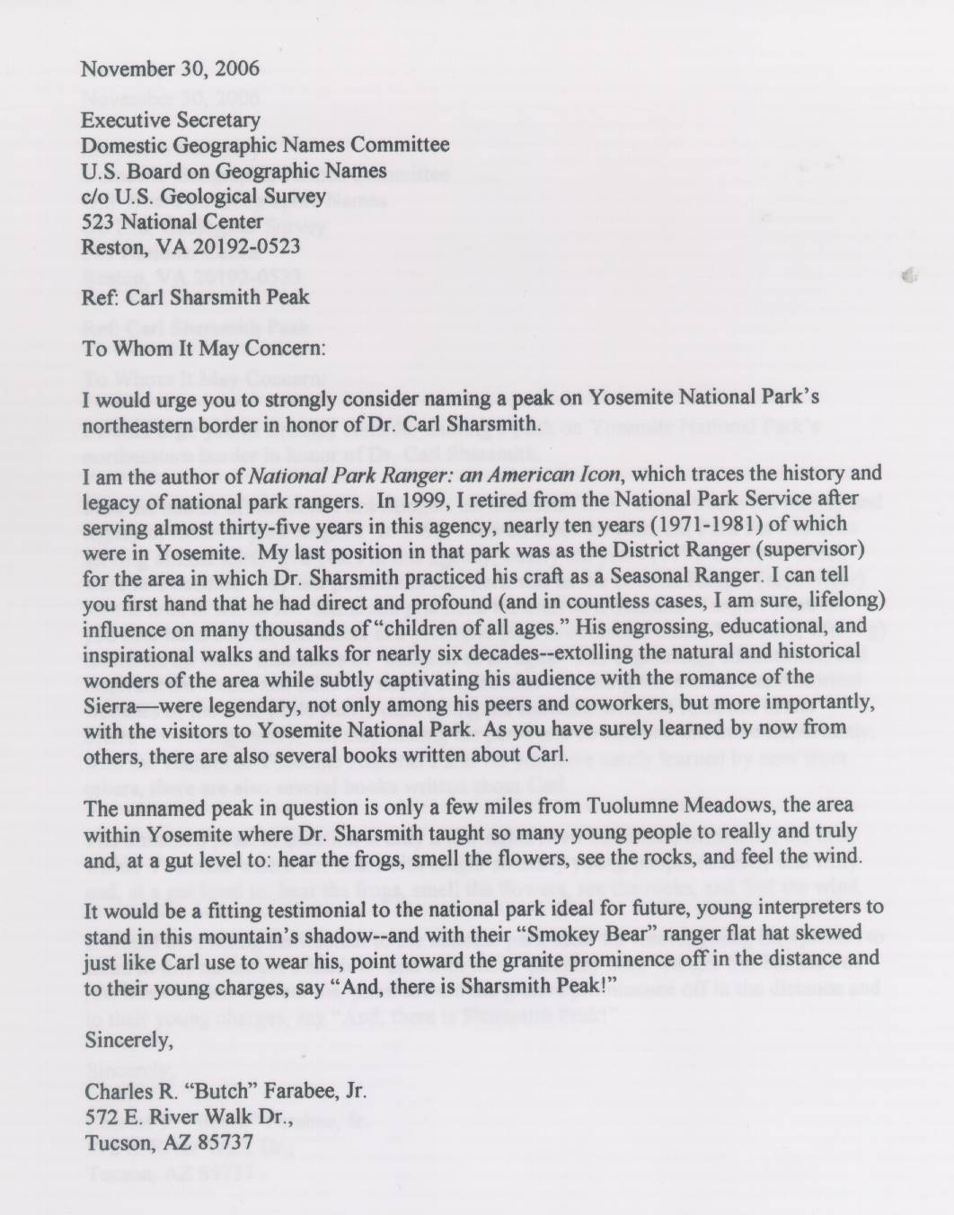 Home & Synopsis/Status Reports Purpose & Method Who was Carl Sharsmith? Why name a Yosemite feature for Carl?/Origin of Proposal Which feature should be named for Carl? How can a feature be named for Carl? SUMMARY OF SUPPORTING STATEMENTS Contacts/Resources Webmaster Search Form