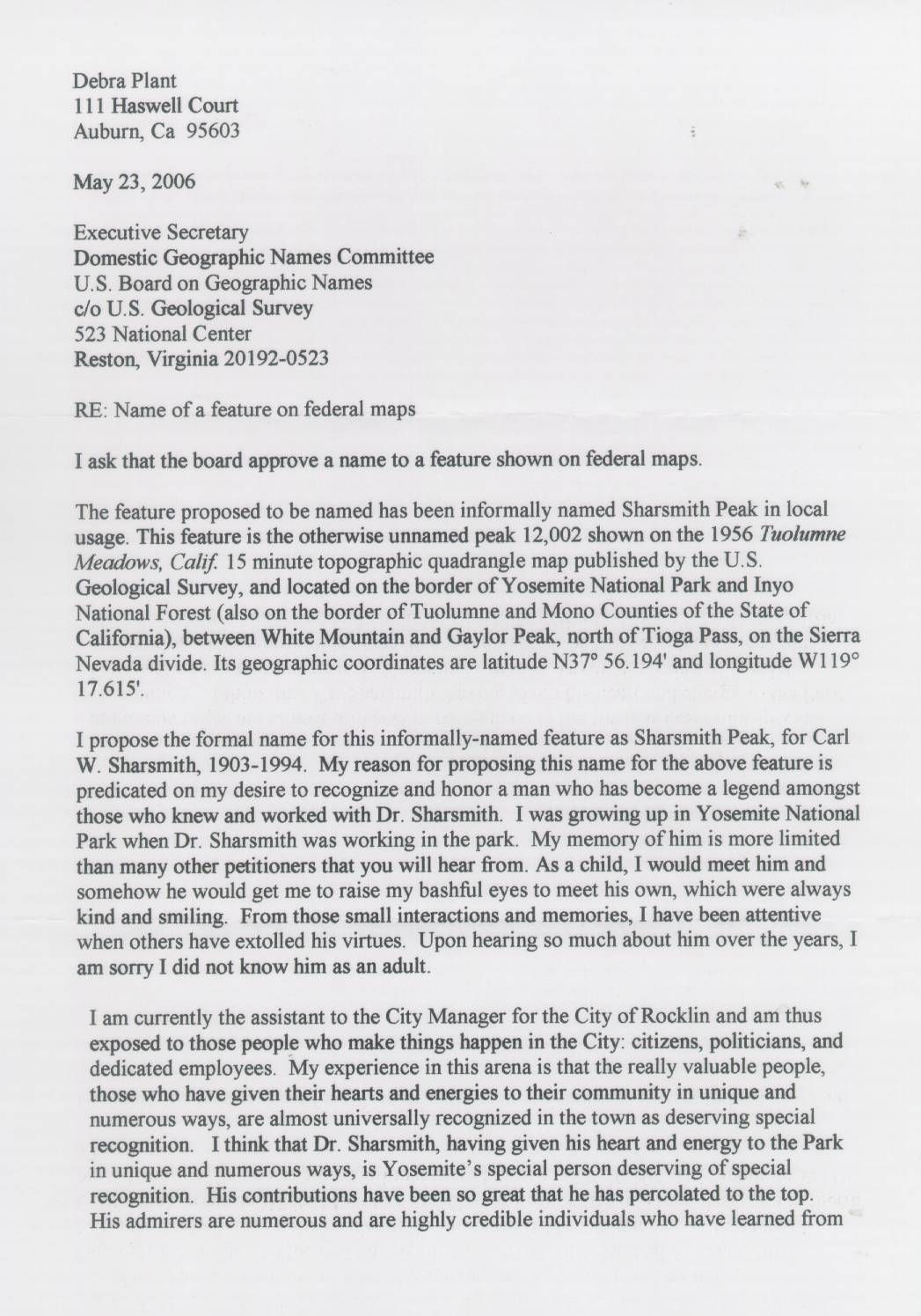 Home & Synopsis/Status Reports   Purpose & Method  Who was Carl Sharsmith?  Why name a Yosemite feature for Carl?/Origin of Proposal   Which feature should be named for Carl?  How can a feature be named for Carl?  SUMMARY OF SUPPORTING STATEMENTS    Contacts/Resources Webmaster Search Form