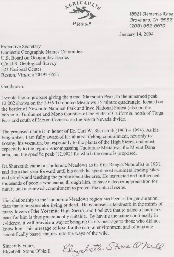 Elizabeth Stone O'Neil. Author of Mountain Sage: The Life Story of Carl Sharsmith, Yosemite's Famous Ranger-Naturalist. Co-author of Tioga Tramps: Day Hikes in the Tioga Pass Region, publisher of Albicaulis Press.