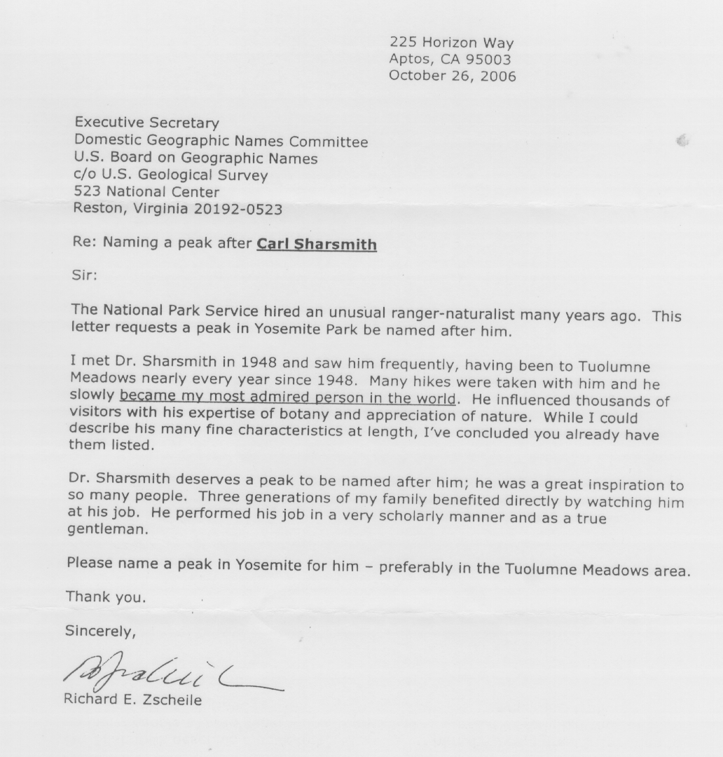 Home & Synopsis/Status Reports Purpose & Method Who was Carl Sharsmith? Why name a Yosemite feature for Carl?/Origin of Proposal Which feature should be named for Carl? How can a feature be named for Carl? SUMMARY OF SUPPORTING STATEMENTS Contacts/Resources Webmaster Search Form
