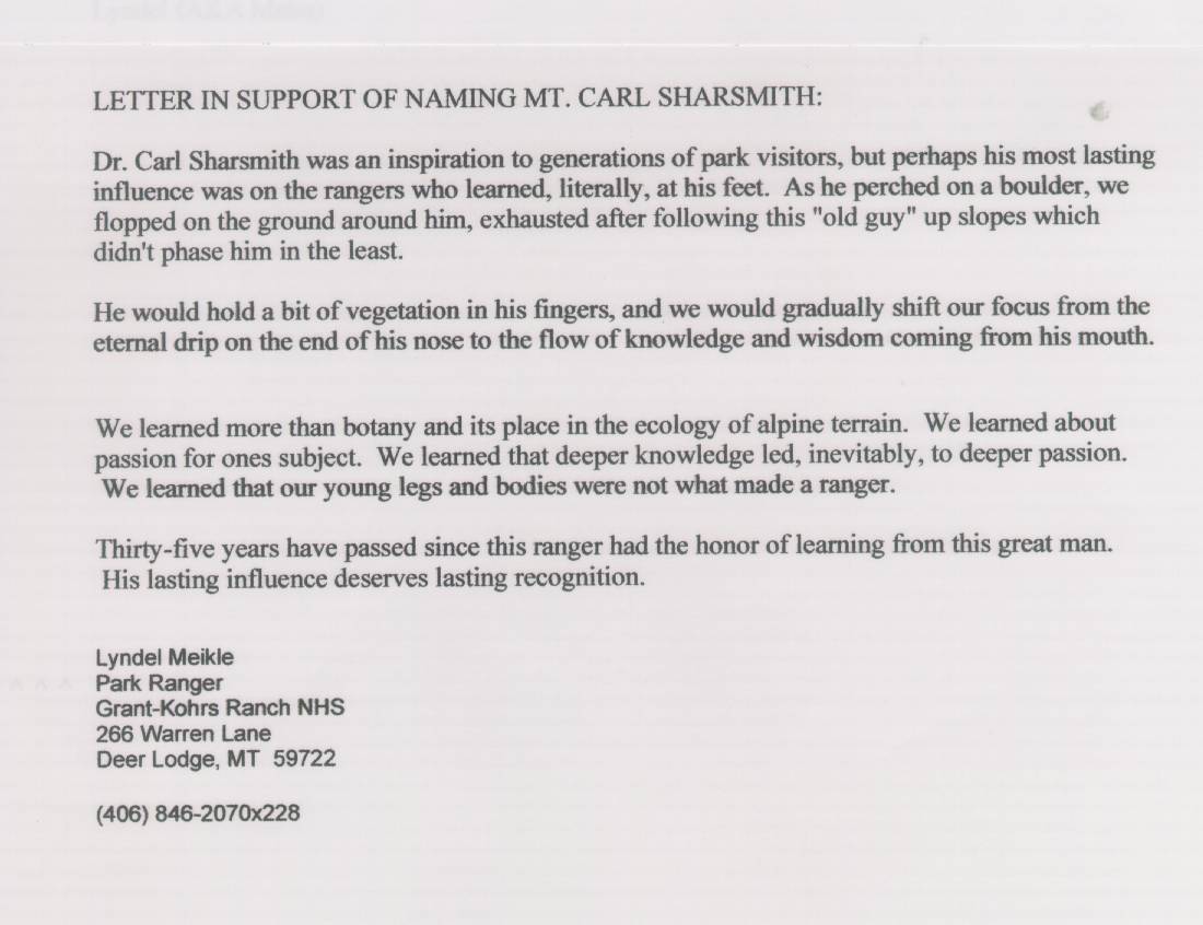 Home & Synopsis/Status Reports Purpose & Method Who was Carl Sharsmith? Why name a Yosemite feature for Carl?/Origin of Proposal Which feature should be named for Carl? How can a feature be named for Carl? SUMMARY OF SUPPORTING STATEMENTS Contacts/Resources Webmaster Search Form