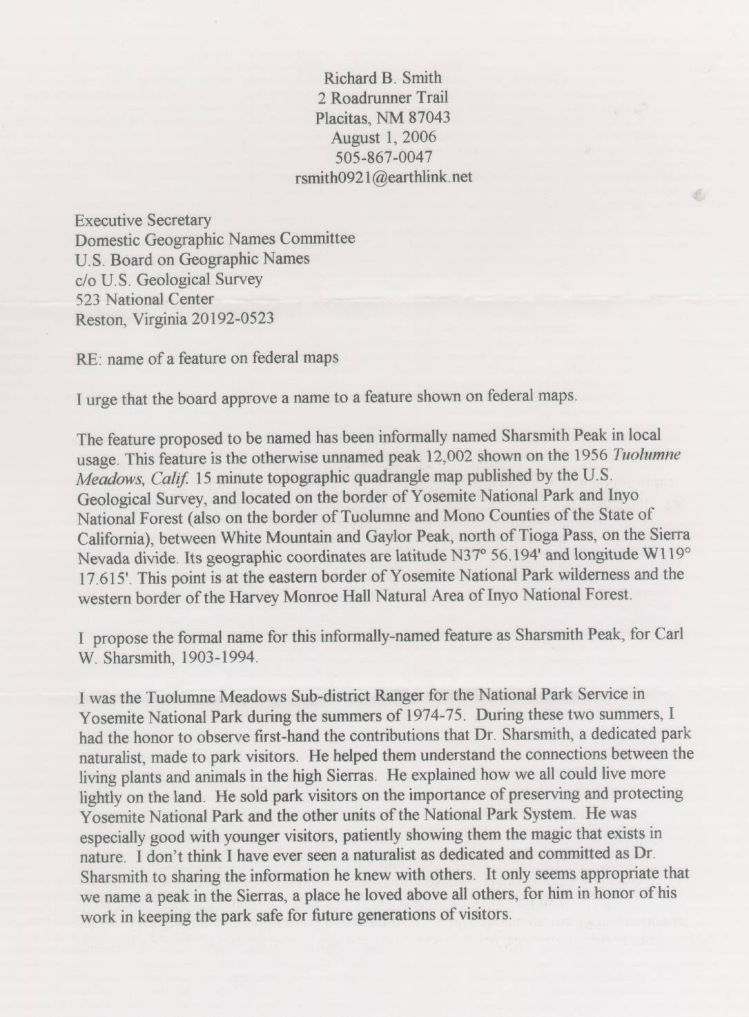 Home & Synopsis/Status Reports Purpose & Method Who was Carl Sharsmith? Why name a Yosemite feature for Carl?/Origin of Proposal Which feature should be named for Carl? How can a feature be named for Carl? SUMMARY OF SUPPORTING STATEMENTS Contacts/Resources Webmaster Search Form