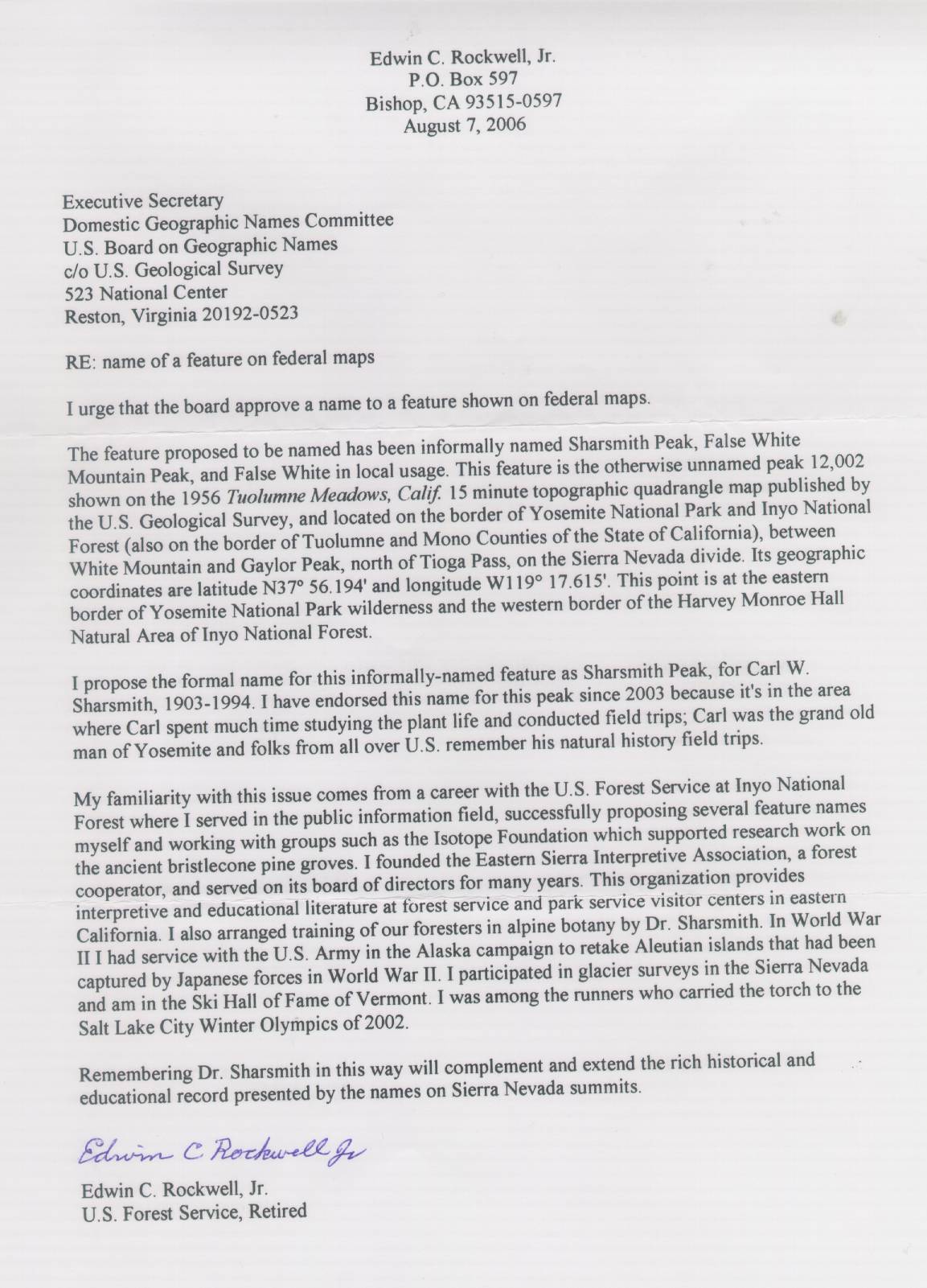 Rocky Rockwell. Board member Eastern Sierra Interpretive Association and long-time forest ranger and information officer for Inyo National Forest, Bishop, CA, involved in successful naming proposals for Norman Clyde: Clyde Glacier and Clyde Meadow. Former Ski Trooper U.S. Army, Member Vermont Ski Hall of Fame. Retired. Based in Bishop, California,