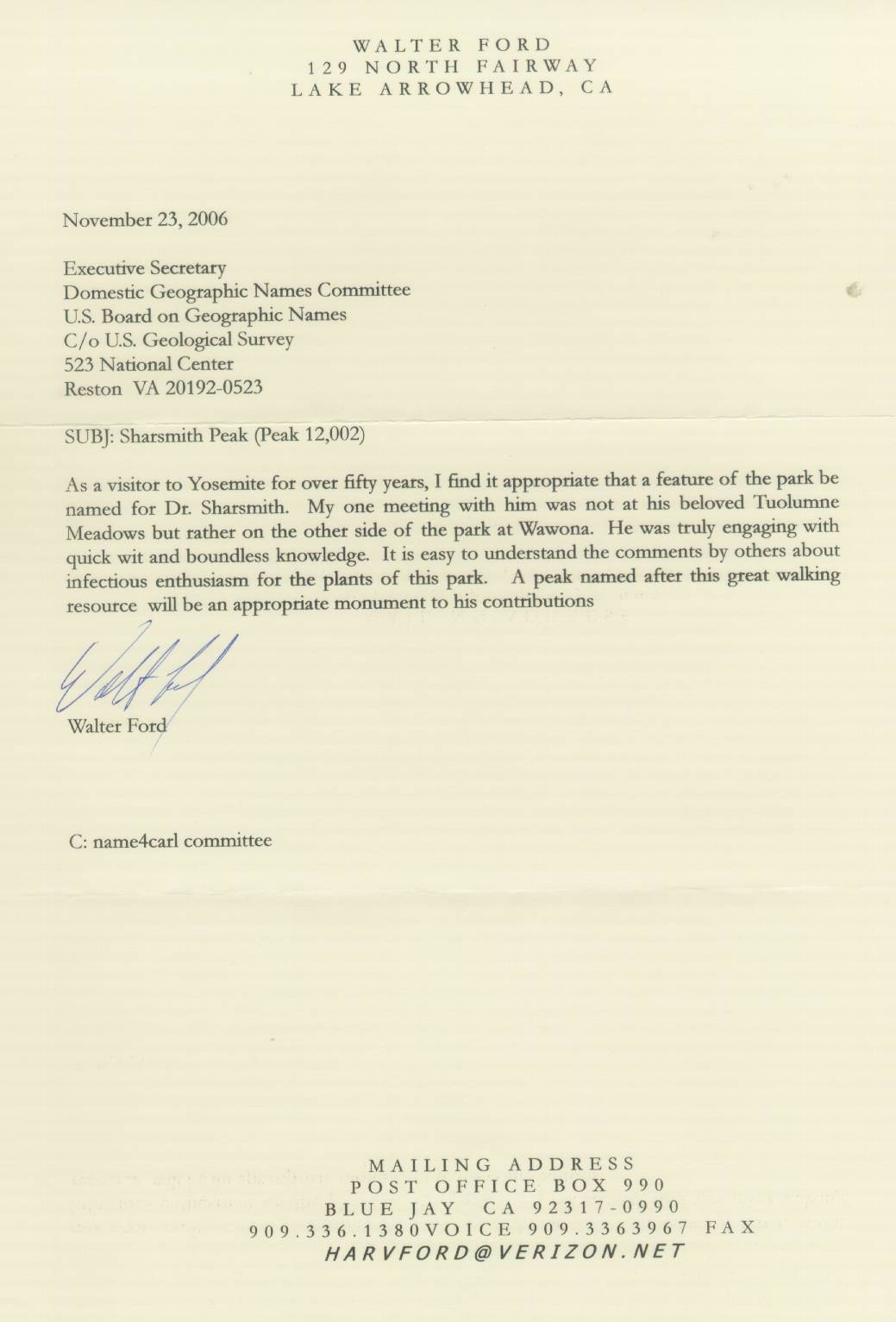 Walter Ford. Yosemite visitor for over 50 years.