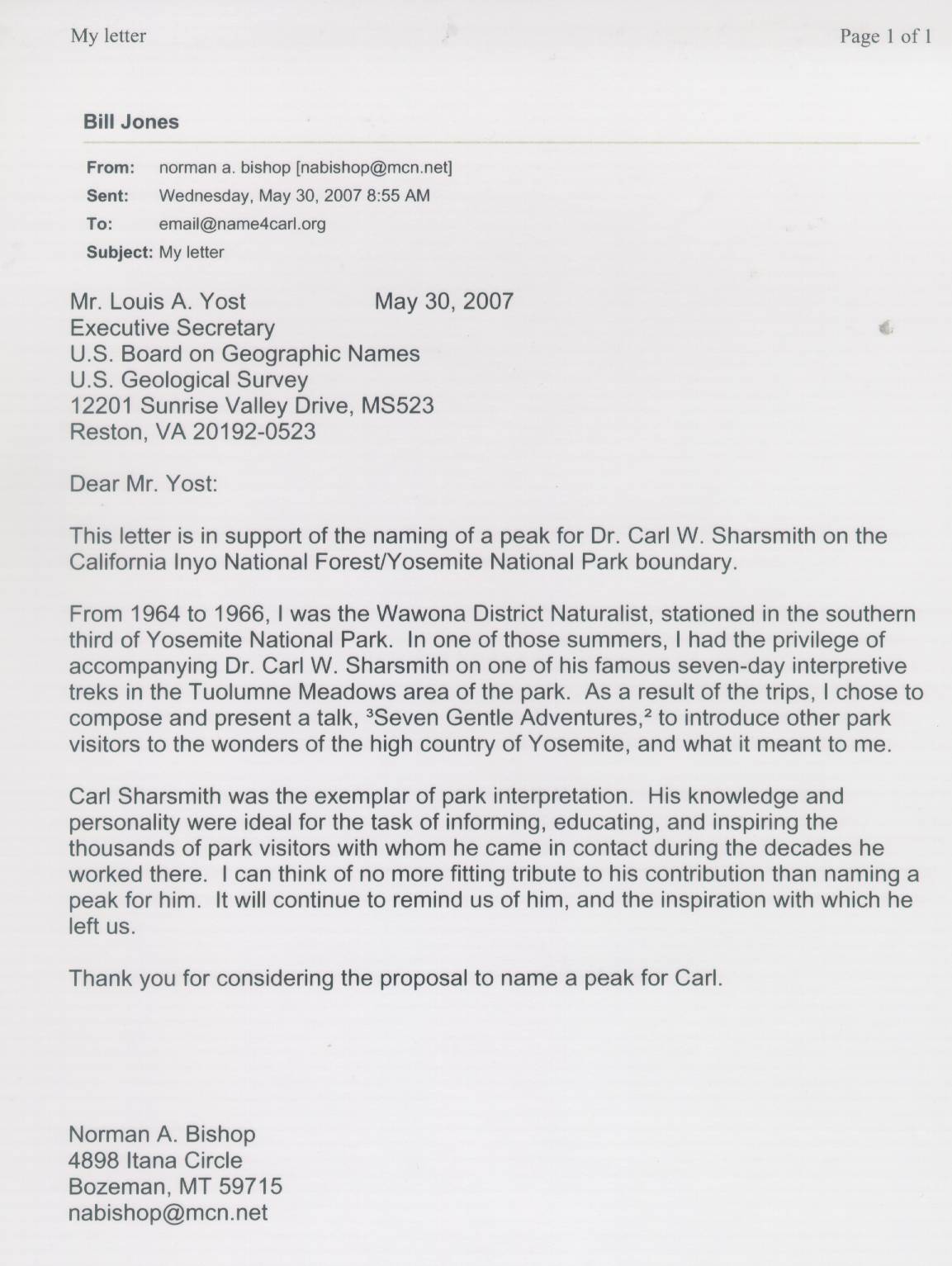 Home & Synopsis/Status Reports Purpose & Method Who was Carl Sharsmith? Why name a Yosemite feature for Carl?/Origin of Proposal Which feature should be named for Carl? How can a feature be named for Carl? SUMMARY OF SUPPORTING STATEMENTS Contacts/Resources Webmaster Search Form